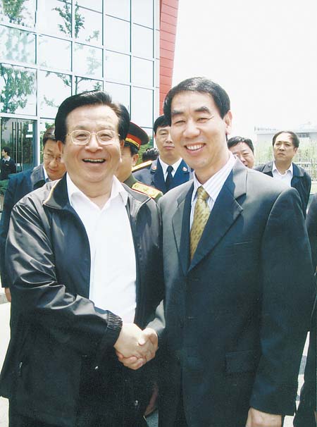 (图为中共中央政治局常委、国家副主席曾庆红在上海市中国浦东干部学院与市委书记王铁合影留念。黄 刚 摄)